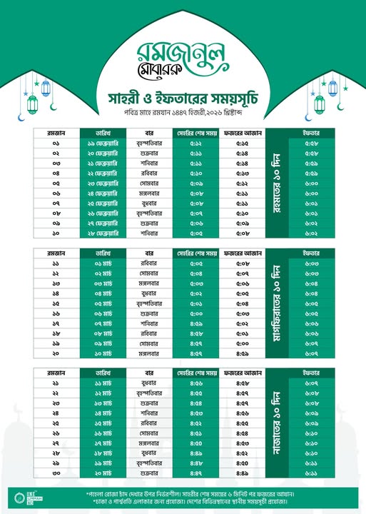 30-Day Ramadan Sehri & Iftar Timetable for Dhaka (2026)