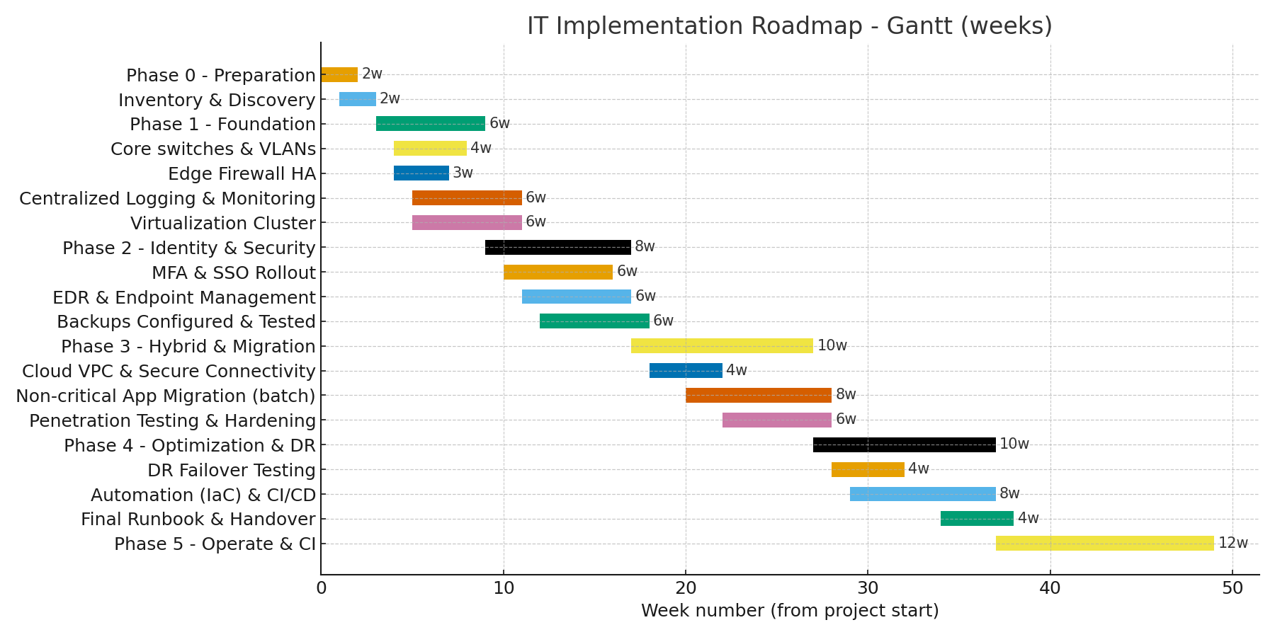 This document provides a practical, phased IT architectural plan and implementation roadmap suitable for a mid-sized organization (50–500 users). It covers objectives, assumptions, target architecture (logical & physical), network and security design, data management, backup & disaster recovery, operations (monitoring, patching), implementation timeline, roles, risk register, KPIs, and templates you can reuse.